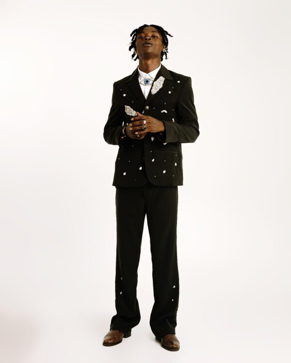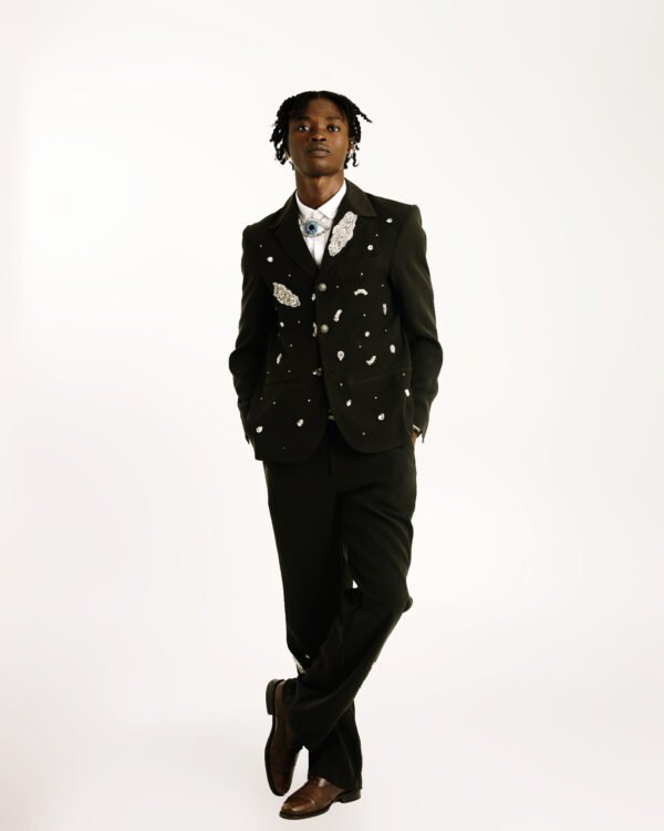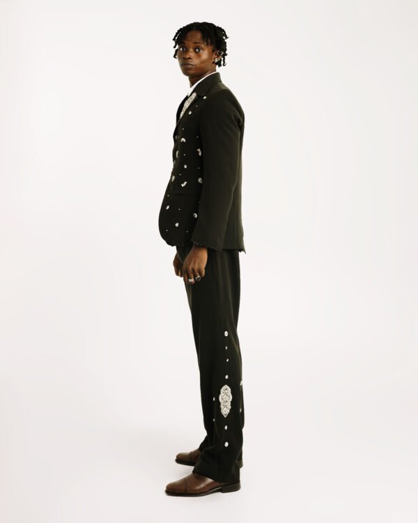 A refined suit set from the John&co 1801 line, crafted in premium crepe fabric and embellished with crystal appliqué detailing. The jacket and trousers combine tailored sophistication with subtle sparkle, making it a statement ensemble for elevated occasions.